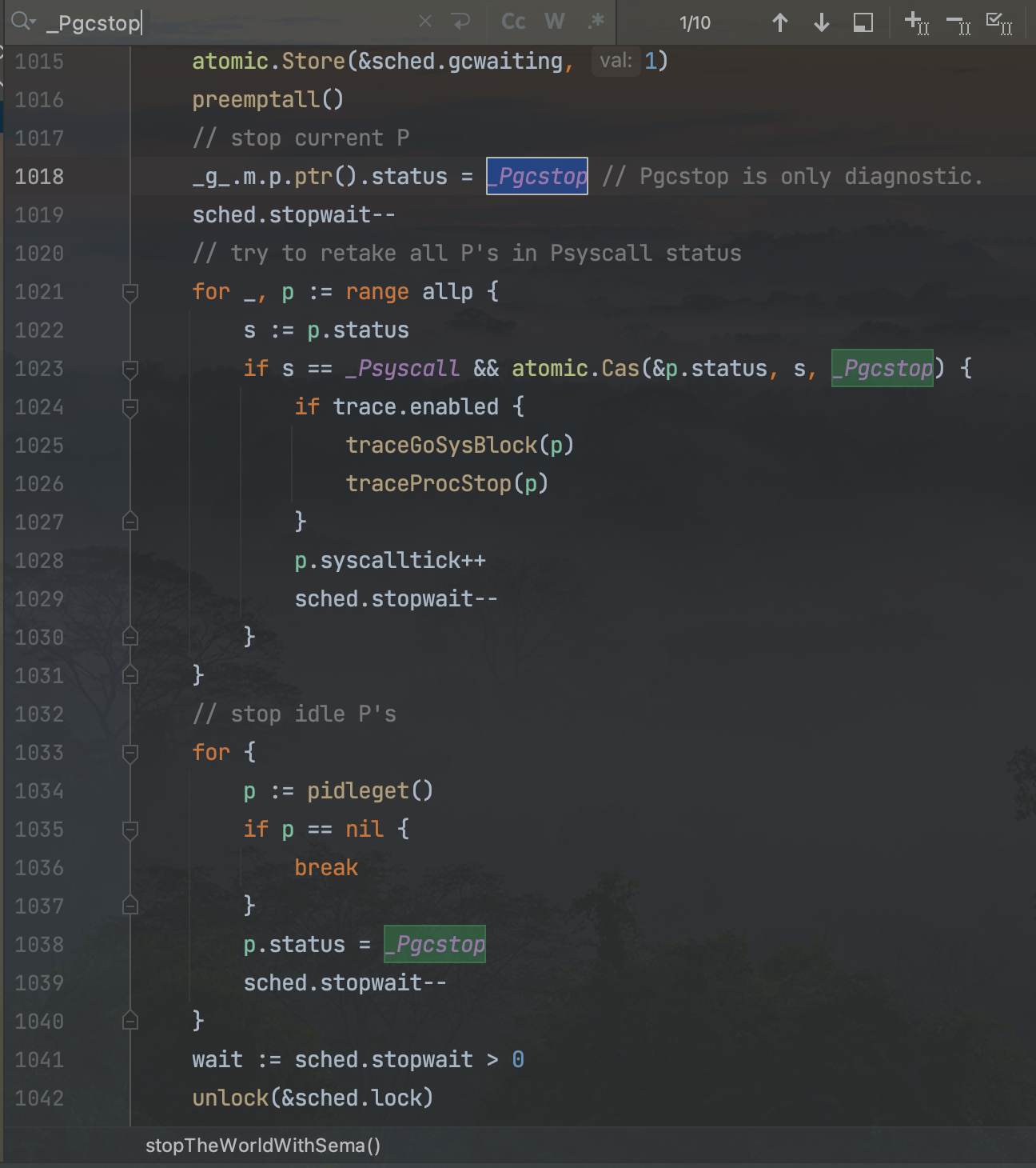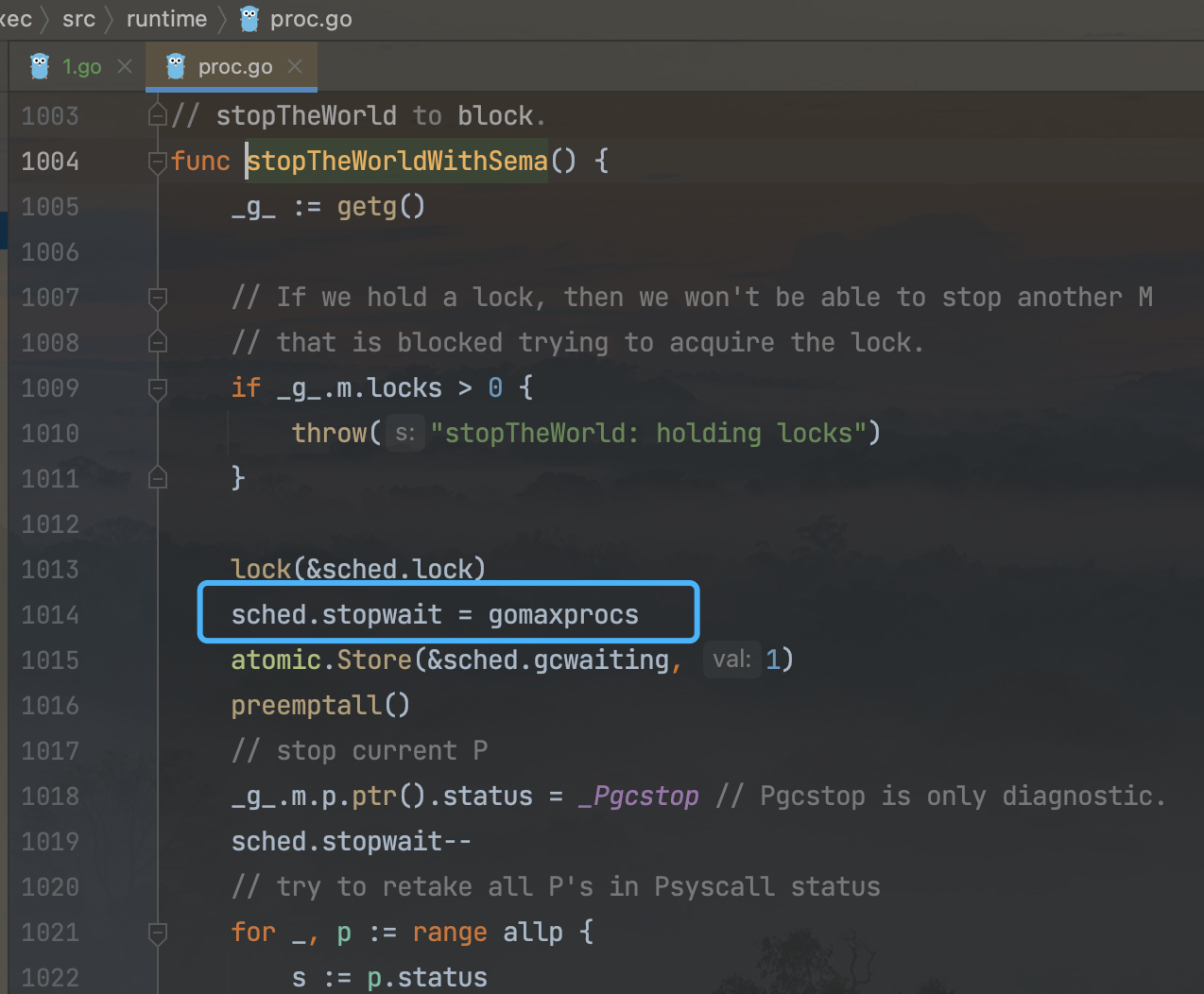 可以看到实际阻塞发生在runtime.futex这里,再往上倒,会找到runtime.gcStart。阻塞发生在gcStart所在文件的第1287行。