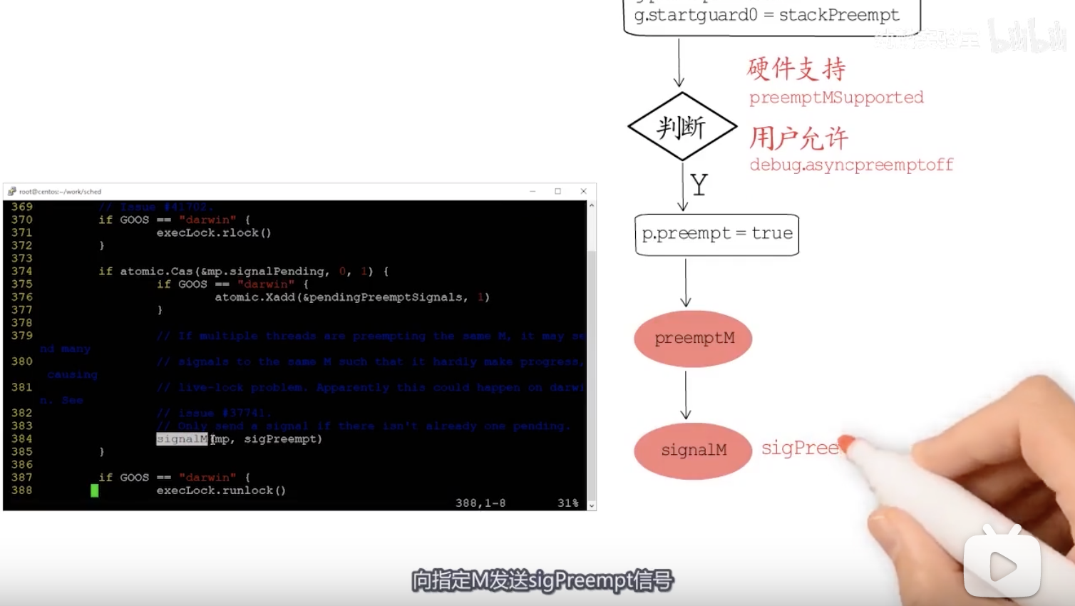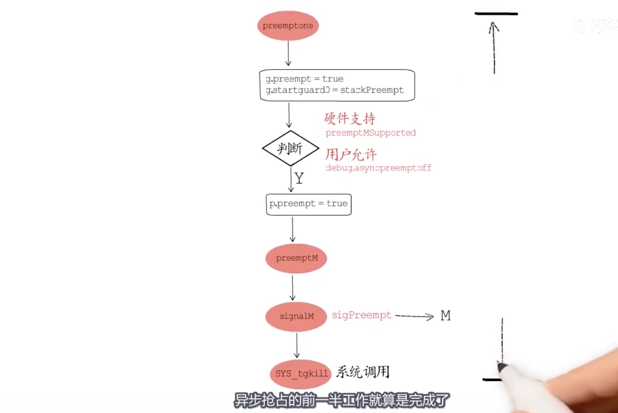 该函数的主要逻辑是,通过runtime.signalM函数,向指定M发送sigPreempt信号---- 会调用操作系统中信号相关的系统调用,将指定信号发送给目标线程。 信号发出去了,异步抢占的前一半工作就算是完成了