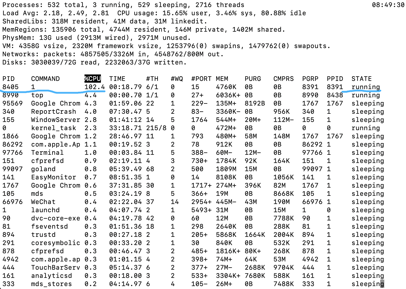 机器是多核CPU,执行top命令,发现程序仍然在运行中。