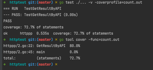- 展示测试覆盖率,并生成覆盖统计文件到 count.out: