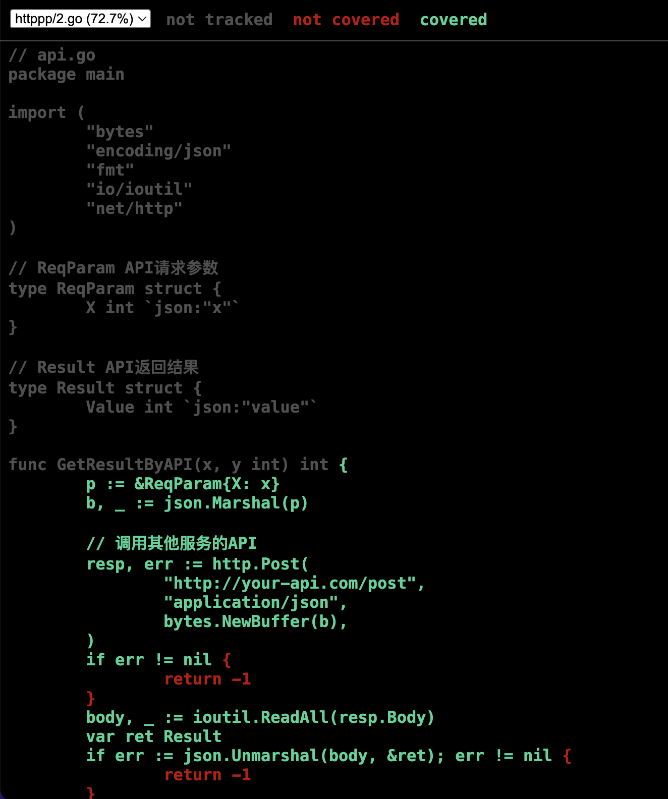 对这类场景写单测时,不想在测试过程中真正去发送请求(或依赖的外部接口还未开发完成),可以在单元测试中使用gock这个库,对依赖的API进行mock。