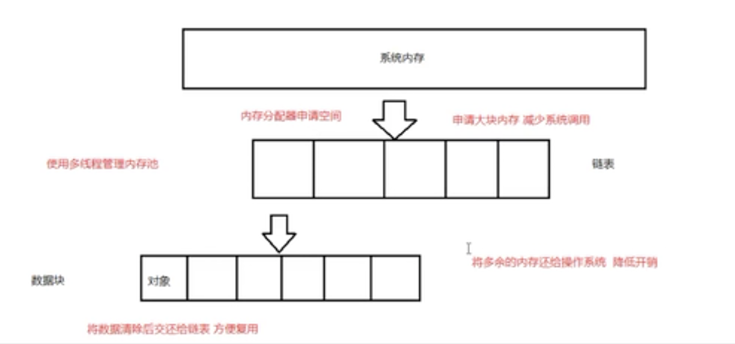 回收对象内存时,将该小块内存重新归还到原链表,以便复用(而不是归还给操作系统,这样能减少系统调用)