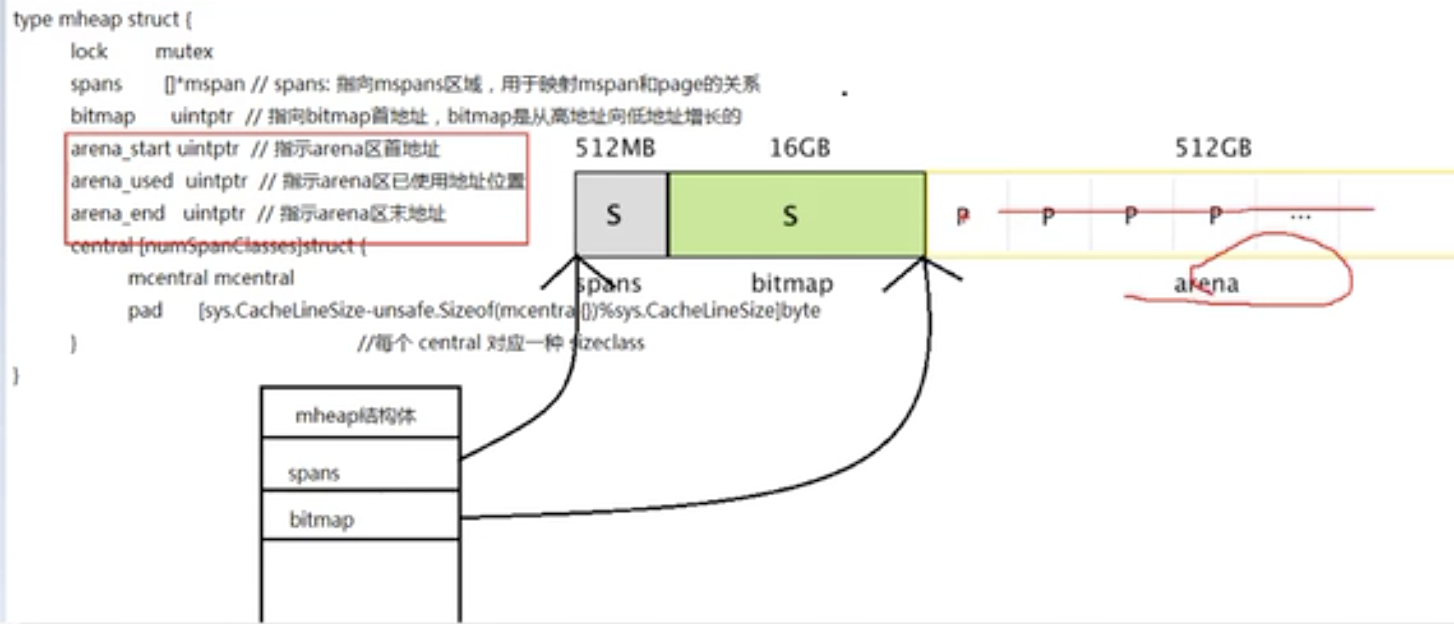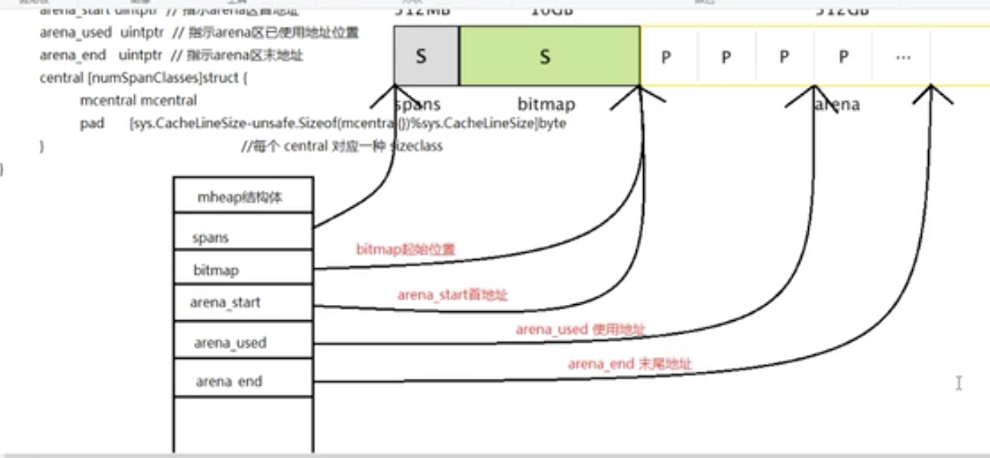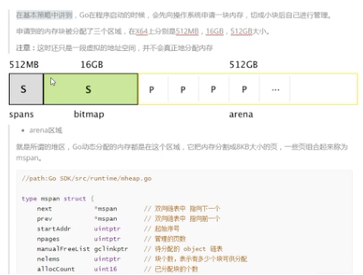 在Go语言的内存管理中,有三个关键的概念:Arena(池)、Bitmap(位图)和Spans(跨度)。
