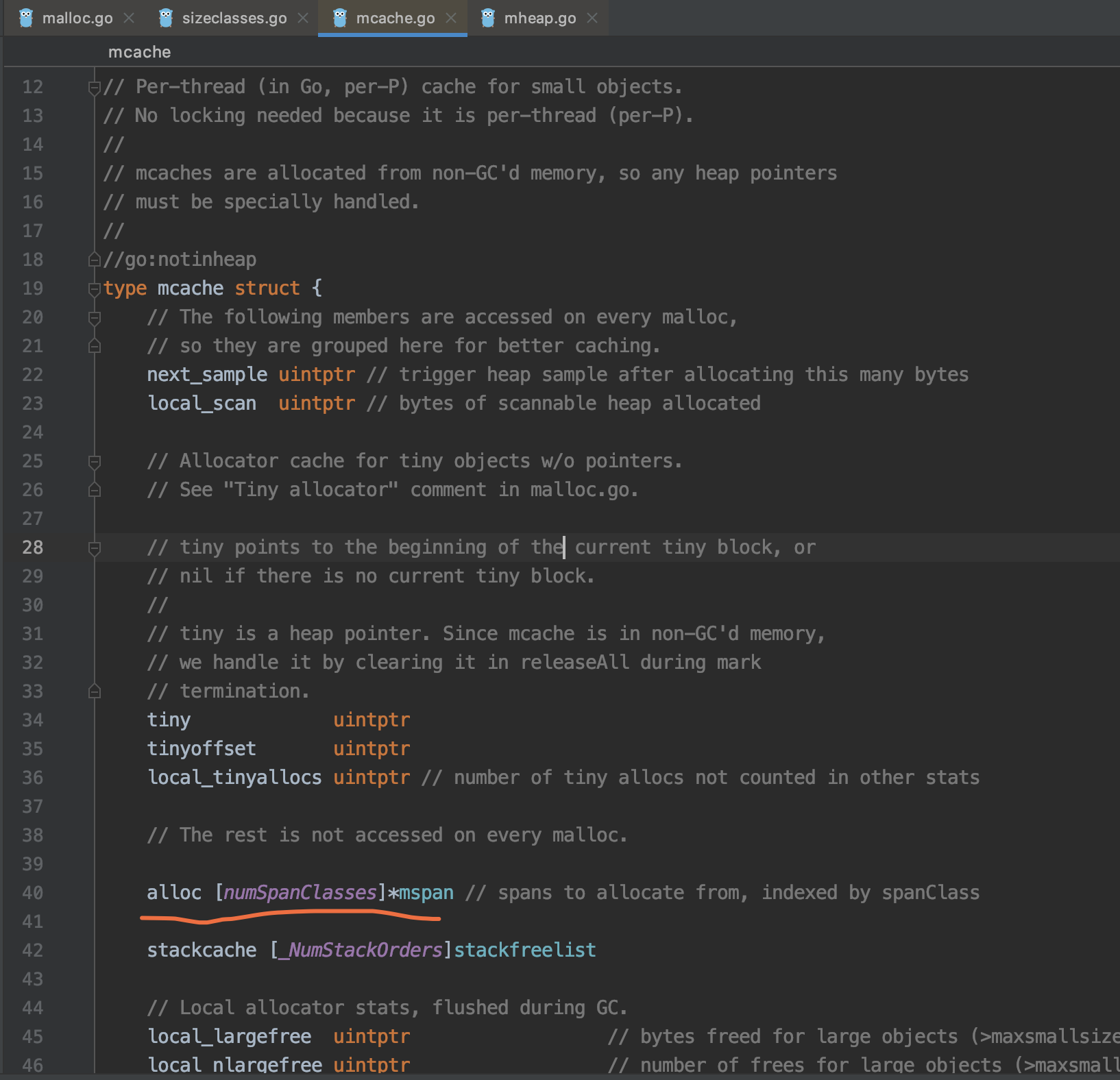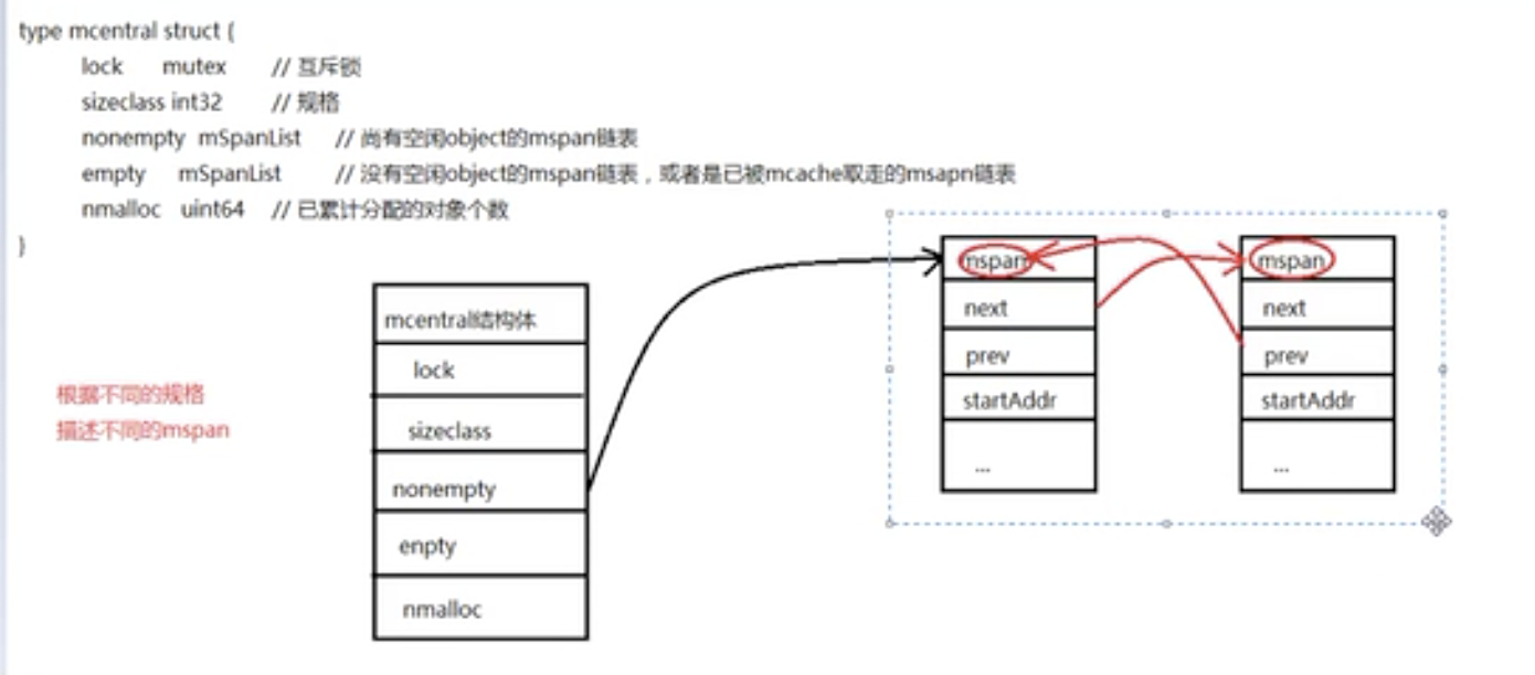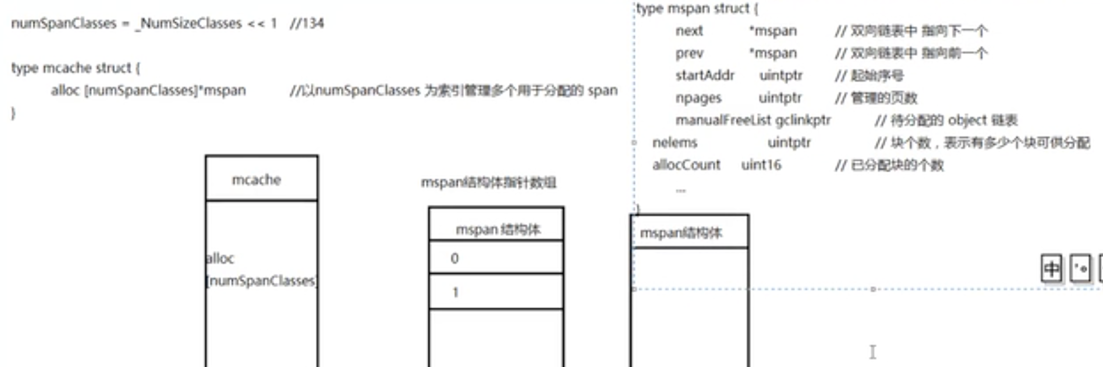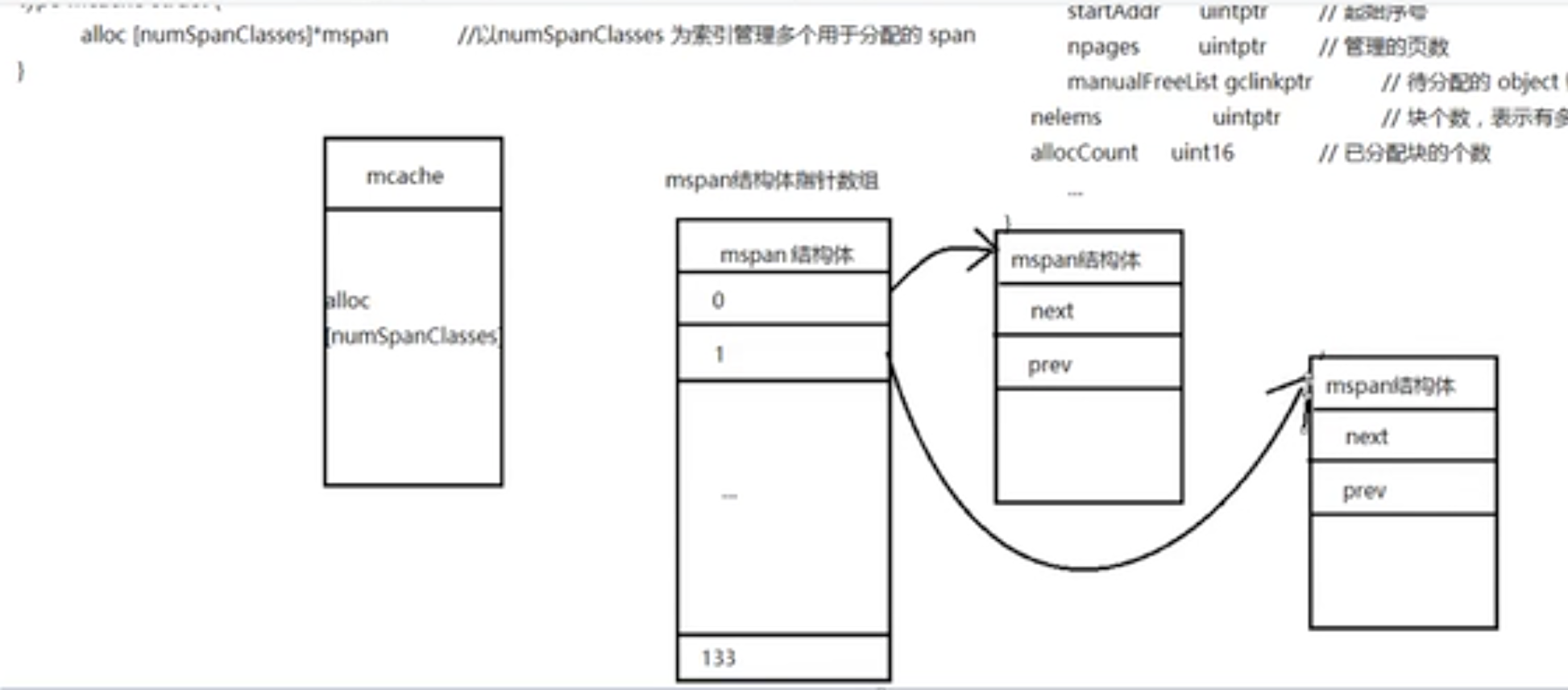 最接近数据块的是mcache,其每一个对象都绑定着相关信息,想使用时找mcentral,去找到一个对应规格的mspan.