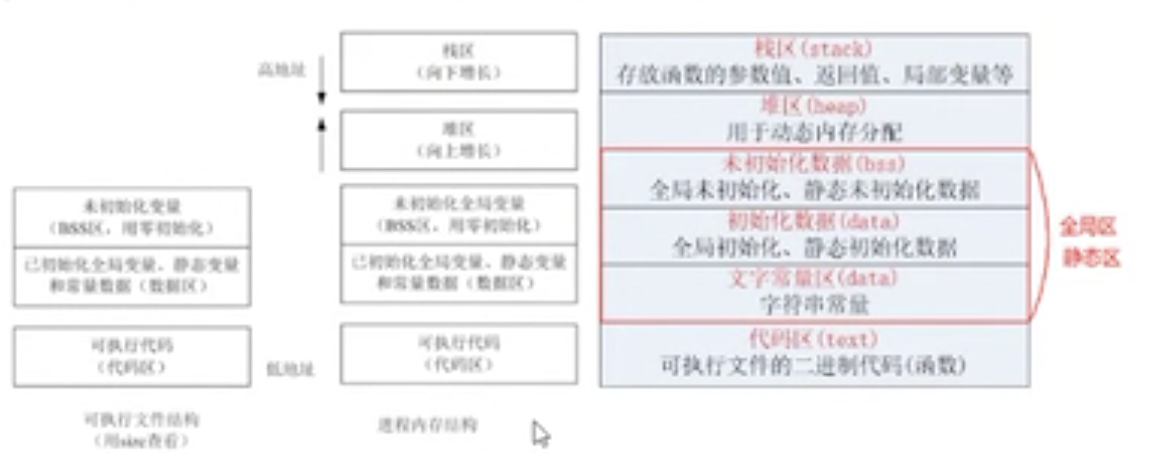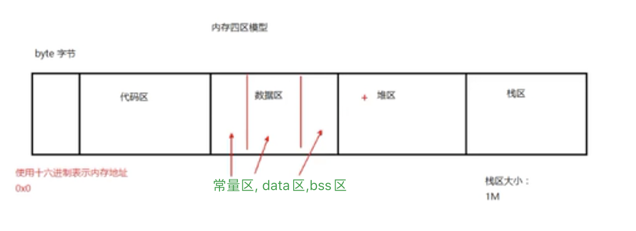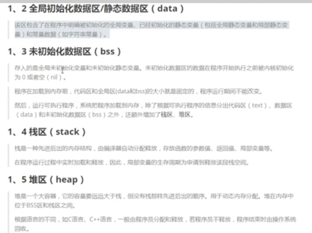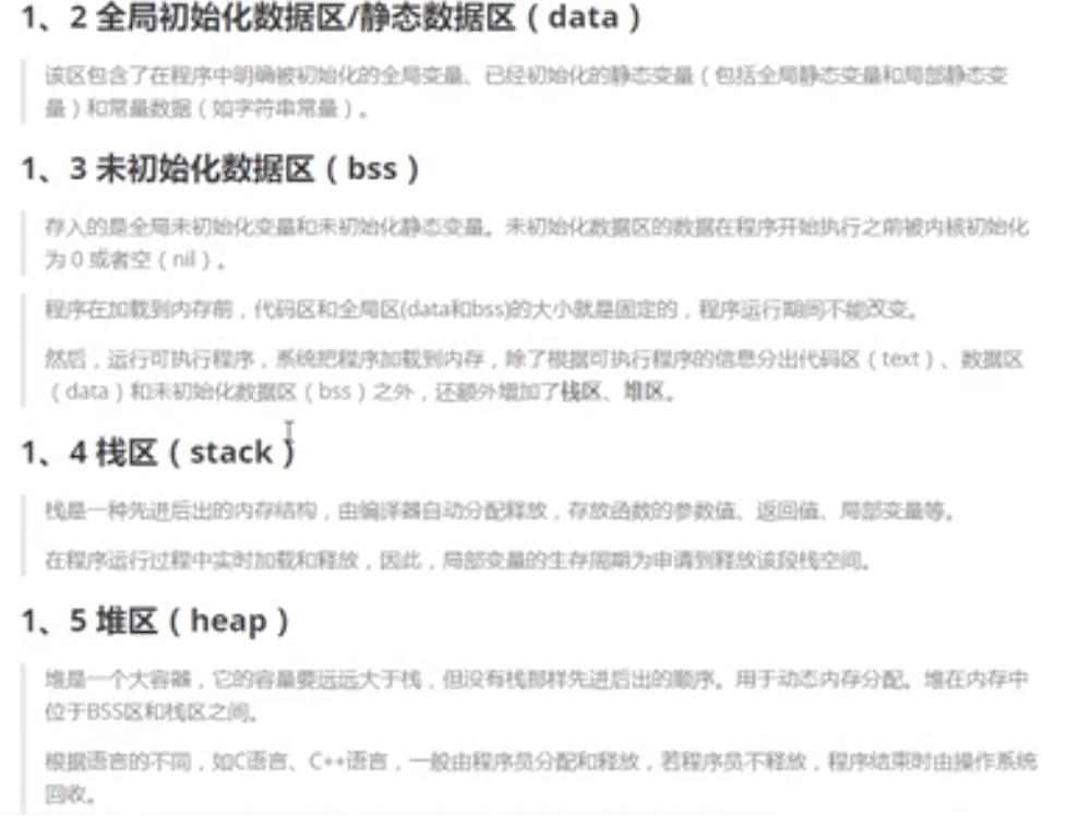 text区,data区和bss区,栈区(stack),堆区(heap),合称内存四区