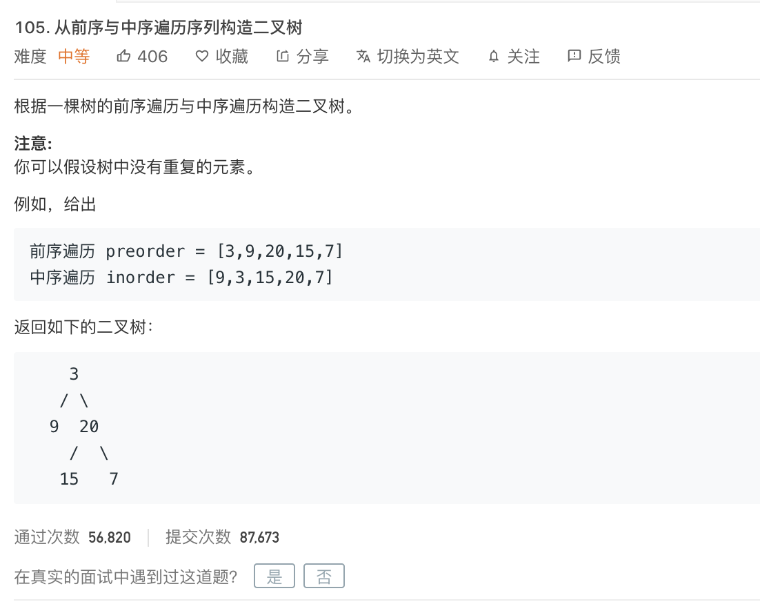leetcode-105 从前序与中序遍历序列构造二叉树 2015年03月01日 Tree 留言 105. 从前序与中序遍历序列构造二叉树 难度: 中等 12345678910111213141516171819202122232425262728293031323334353637383940414243/** * Definition for a binary tree node. * type TreeNode struct { * Val int * Left *TreeNode * Right *TreeNode * } */func buildTree(preorder []int, inorder []int) *TreeNode { var root *TreeNode if len(preorder) < 1 || len(inorder) < 1{ return root } left := find(inorder,preorder[0]) if left < 0{ return root } root = &TreeNode{ Val:preorder[0], Left:buildTree(preorder[1:left+1],inorder[0:left]), Right:buildTree(preorder[left+1:],inorder[left+1:]), } return root}func find(inorder []int,target int) int { for i := 0; i < len(inorder);i++ { if target == inorder[i] { return i } } return -1} 文章目录 原文链接: https://dashen.tech/2015/03/01/leetcode-105-从前序与中序遍历序列构造二叉树/ 版权声明: 转载请注明出处.