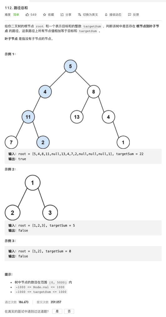 leetcode-112 路径总和 2015年03月01日 Tree 留言 112. 路径总和 难度: 简单 递归求解即可 12345678910111213141516171819202122/** * Definition for a binary tree node. * type TreeNode struct { * Val int * Left *TreeNode * Right *TreeNode * } */func hasPathSum(root *TreeNode, targetSum int) bool { if root == nil { return false } if root.Left == nil && root.Right == nil { return targetSum == root.Val } return hasPathSum(root.Left, targetSum-root.Val) || hasPathSum(root.Right, targetSum-root.Val)} 文章目录 原文链接: https://dashen.tech/2015/03/01/leetcode-112-路径总和/ 版权声明: 转载请注明出处.