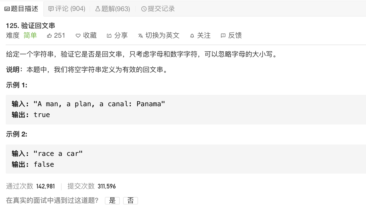 leetcode-125 验证回文串 2015年03月01日 留言 125. 验证回文串 难度: 简单 文章目录 原文链接: https://dashen.tech/2015/03/01/leetcode-125-验证回文串/ 版权声明: 转载请注明出处.