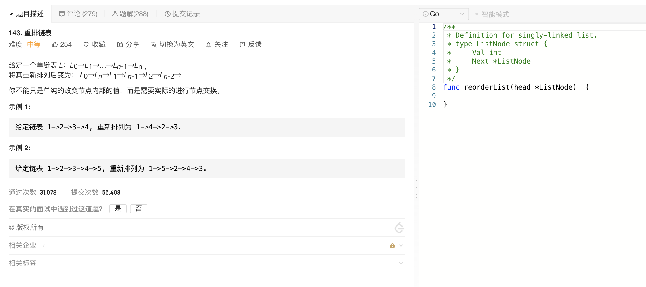 /** * Definition for singly-linked list. * type ListNode struct { * Val int * Next *ListNode * } */ funcreorderList(head *ListNode) { if head == nil || head.Next == nil { return }
