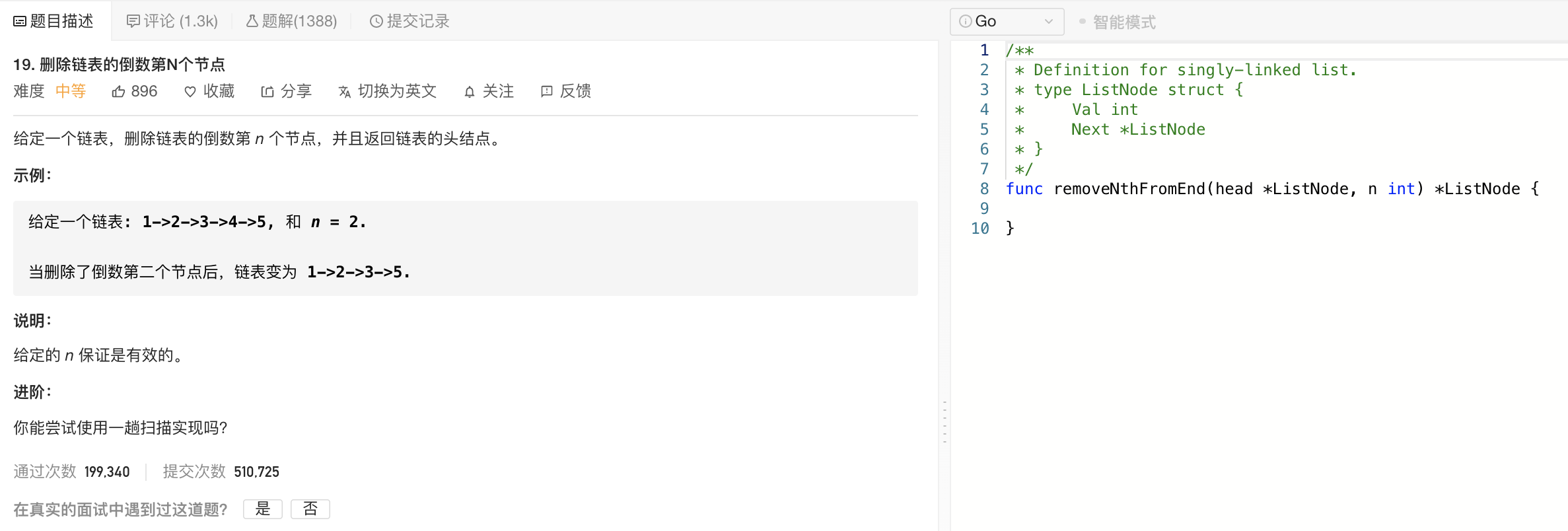 /** * Definition for singly-linked list. * type ListNode struct { * Val int * Next *ListNode * } */ funcremoveNthFromEnd(head *ListNode, n int) *ListNode { dummyHead := &ListNode{Next: head} preSlow, slow, fast := dummyHead, head, head for fast != nil { if n <= 0 { preSlow = slow slow = slow.Next } n-- fast = fast.Next } preSlow.Next = slow.Next return dummyHead.Next }
