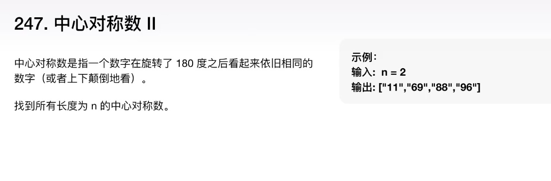 leetcode-247 中心对称数II 2015年03月01日 留言 &此题为使用 递归 进行求解的典型 & 247. 中心对称数II 难度: 中等 文章目录 原文链接: https://dashen.tech/2015/03/01/leetcode-247-中心对称数II/ 版权声明: 转载请注明出处.
