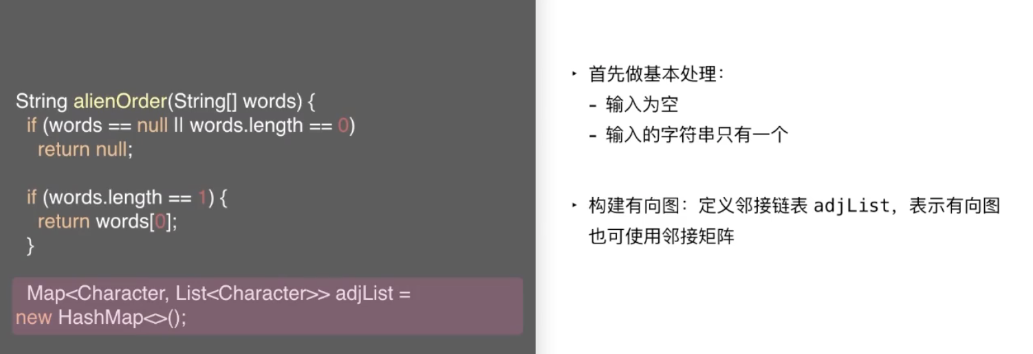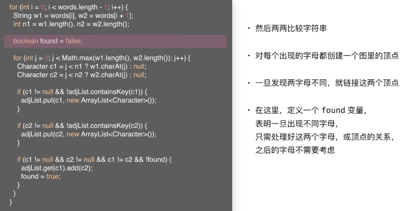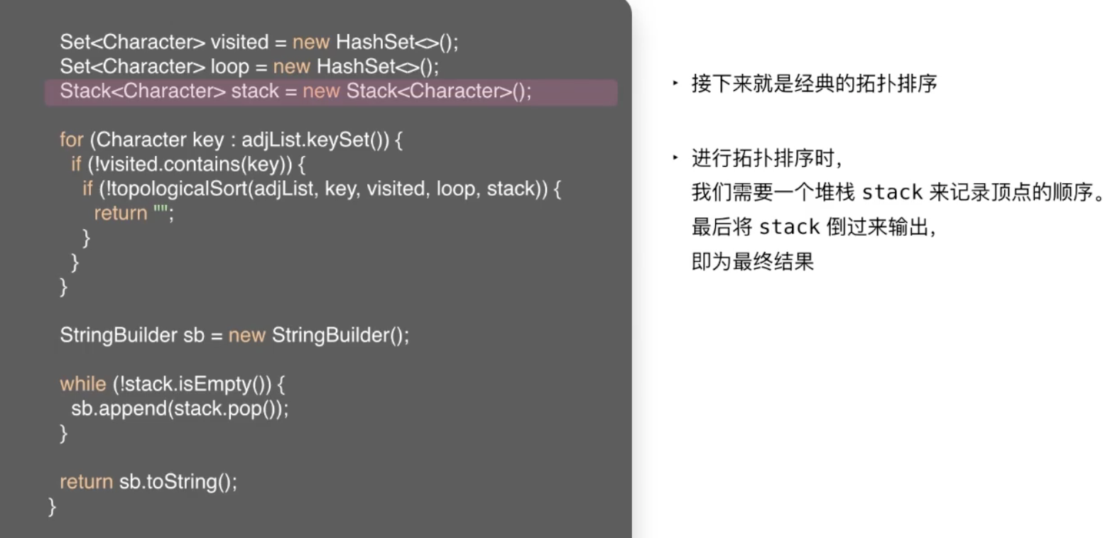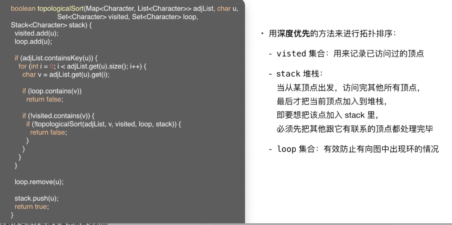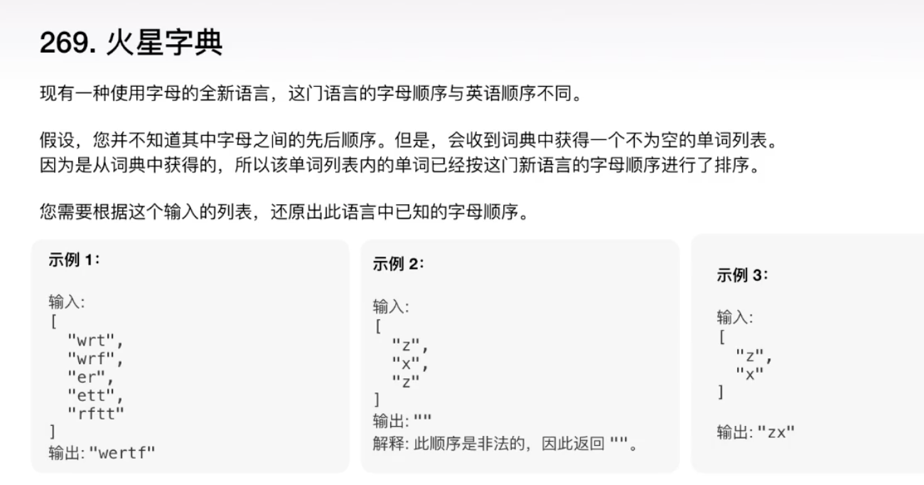拓扑排序,将每个字母看作是图里的顶点,它们之间的关系,是连接顶点与顶点的边,且是有向边,是一个有向图..最后对这个有向图进行拓扑排序