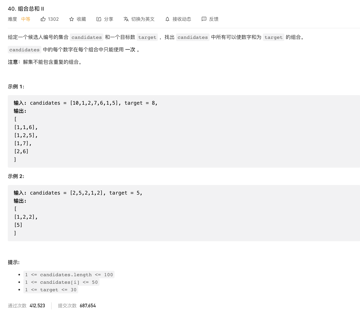 - 要求出总和为 sum 的所有组合,组合需要去重。这一题是第 39 题的加强版,第 39 题中元素可以重复利用(重复元素可无限次使用),这一题中元素只能有限次数的利用,因为存在重复元素,并且每个元素只能用一次(重复元素只能使用有限次)