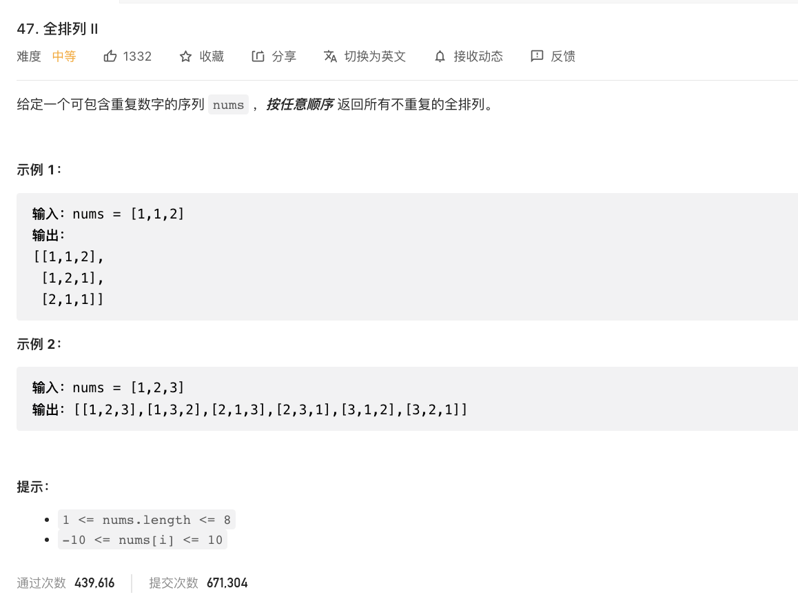 func generatePermutation47(nums []int, index int, p []int, res *[][]int, used *[]bool) { if index == len(nums) { temp := make([]int, len(p)) copy(temp, p) *res = append(*res, temp) return } for i := 0; i < len(nums); i++ { if !(*used)[i] { if i > 0 && nums[i] == nums[i-1] && !(*used)[i-1] { continue } (*used)[i] = true p = append(p, nums[i]) generatePermutation47(nums, index+1, p, res, used) p = p[:len(p)-1] (*used)[i] = false } } return }