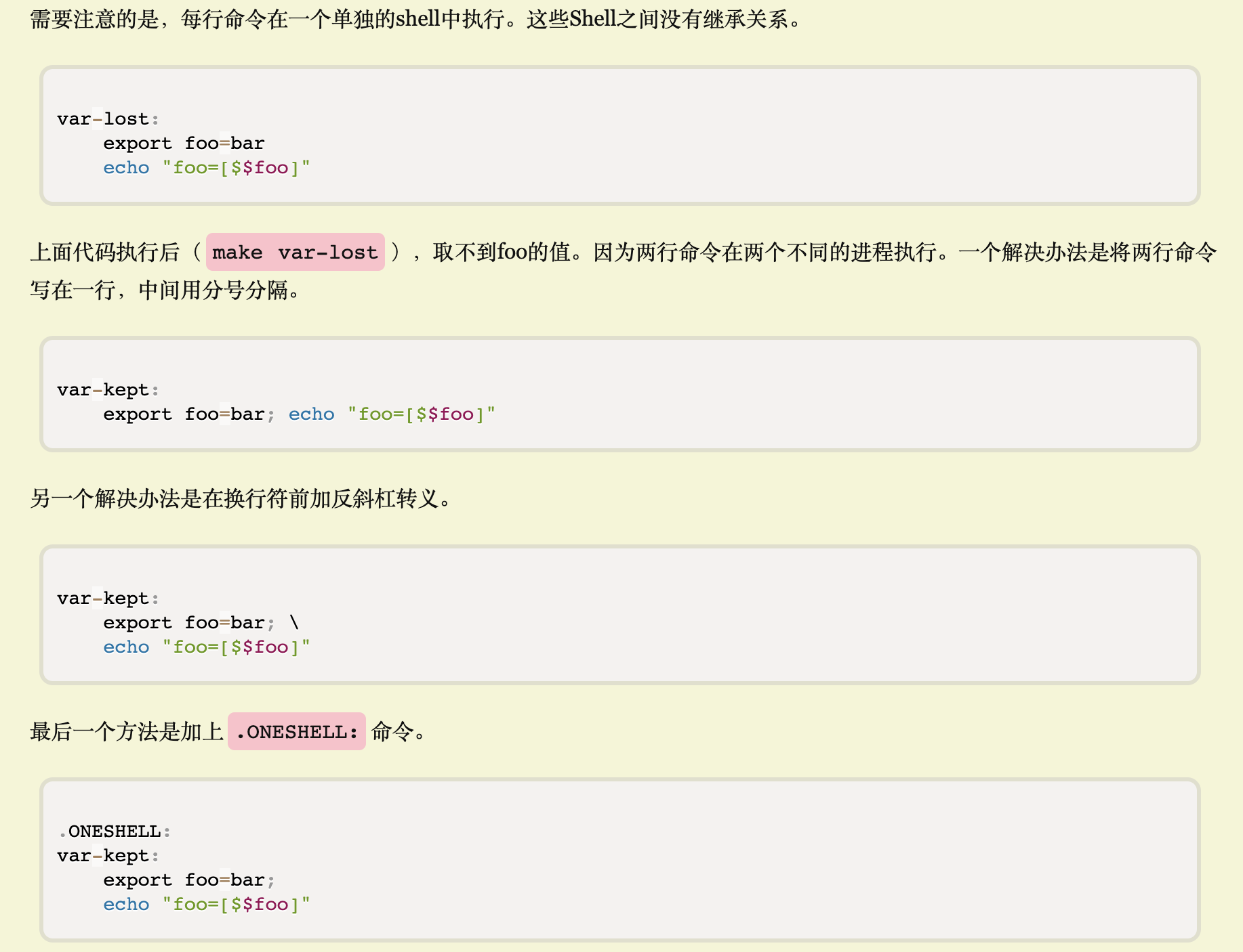 如果想用其他键,可以用内置变量.RECIPEPREFIX声明。每行命令在一个单独的shell中执行,之间没有继承关系