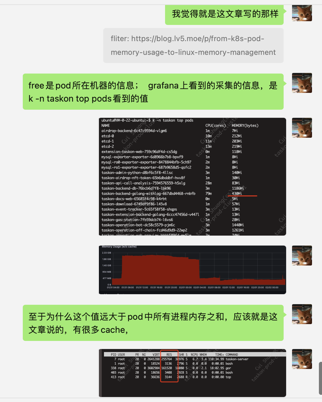 所以我先不去关心free, 所以问题就变成了kubectl top pods 得到的值,远远大于pod中各进程所占实际内存之和