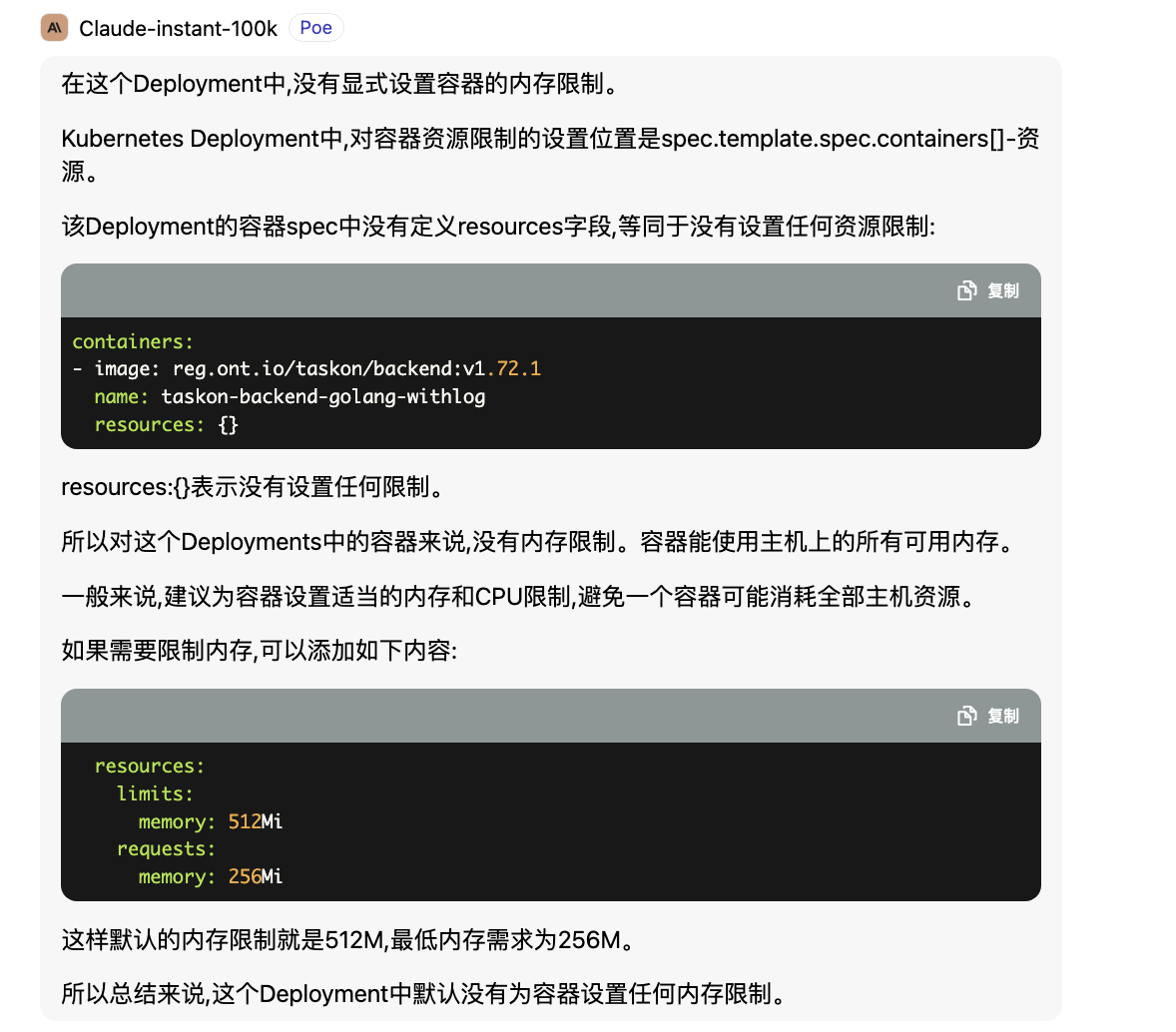 所以总结来说,这个Deployment中默认没有为容器设置任何内存限制。