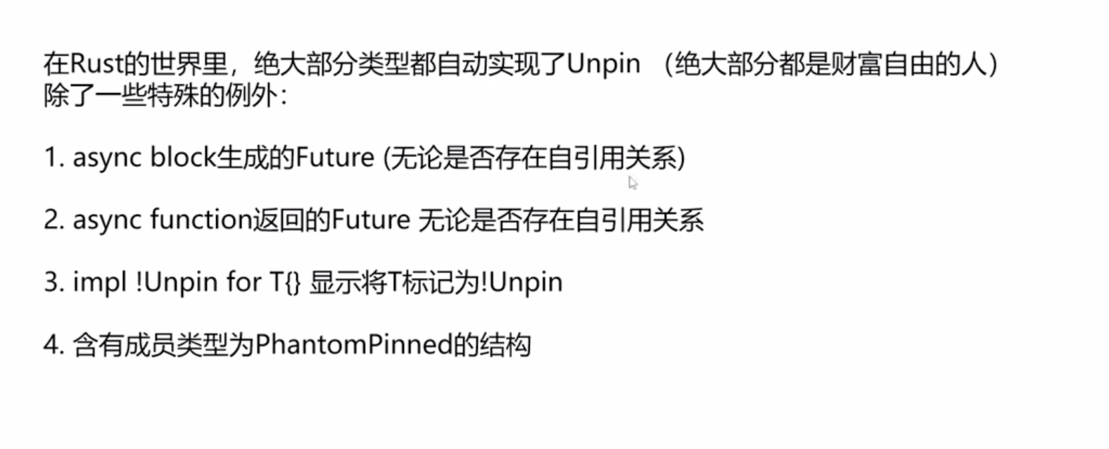 在Rust的世界里,绝大部分类型都是Unpin的,也就是说绝大部分类型都自动实现了Unpin。但是也有一些特殊的例外,主要是下面四个点: