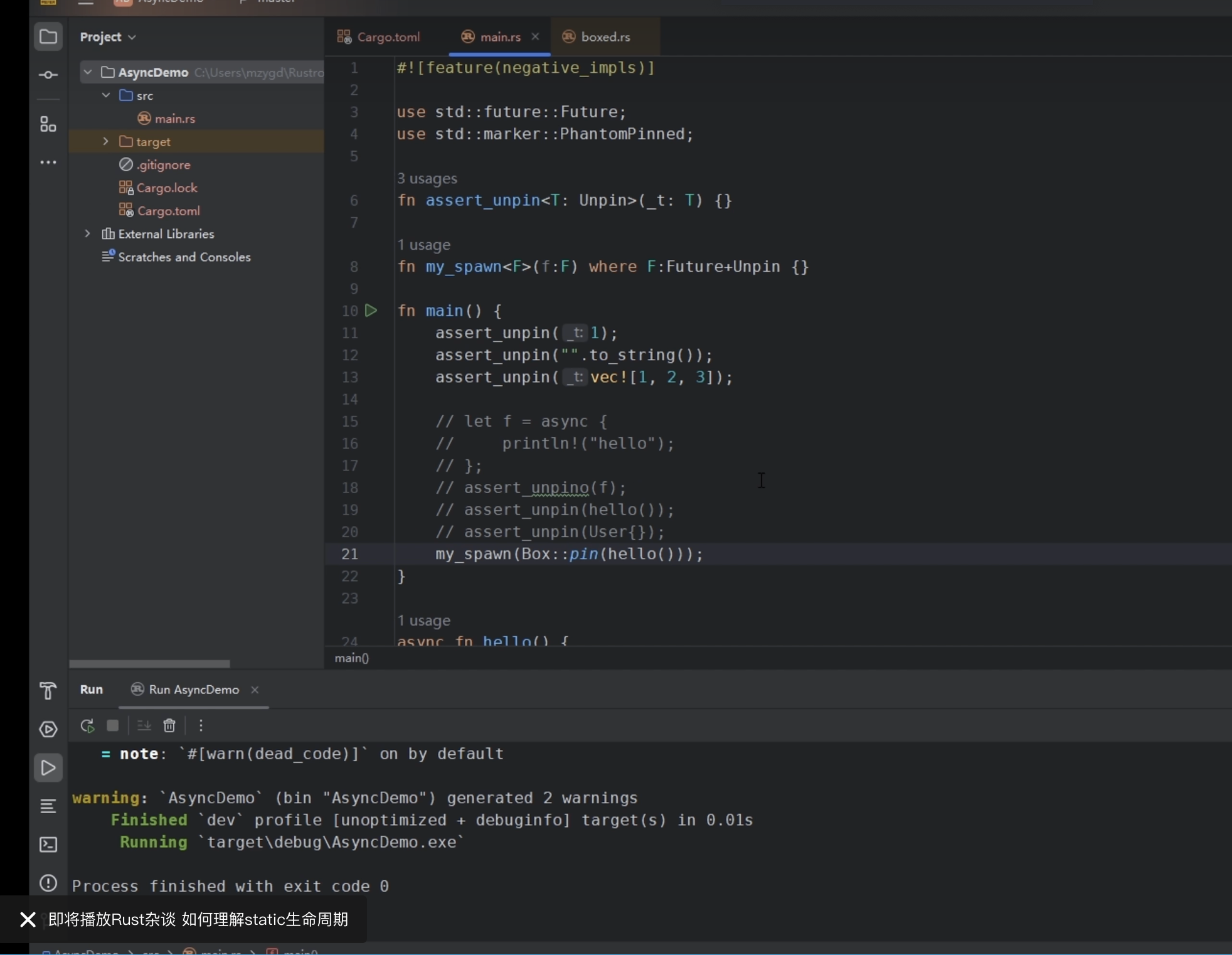 有些异步的运行时实现要求你传入的Future必须是Unpin的,但我们的异步函数和异步块生成的Future都是!Unpin的。那怎么可以传进去呢?答案是需要用到Box::pin。例如: