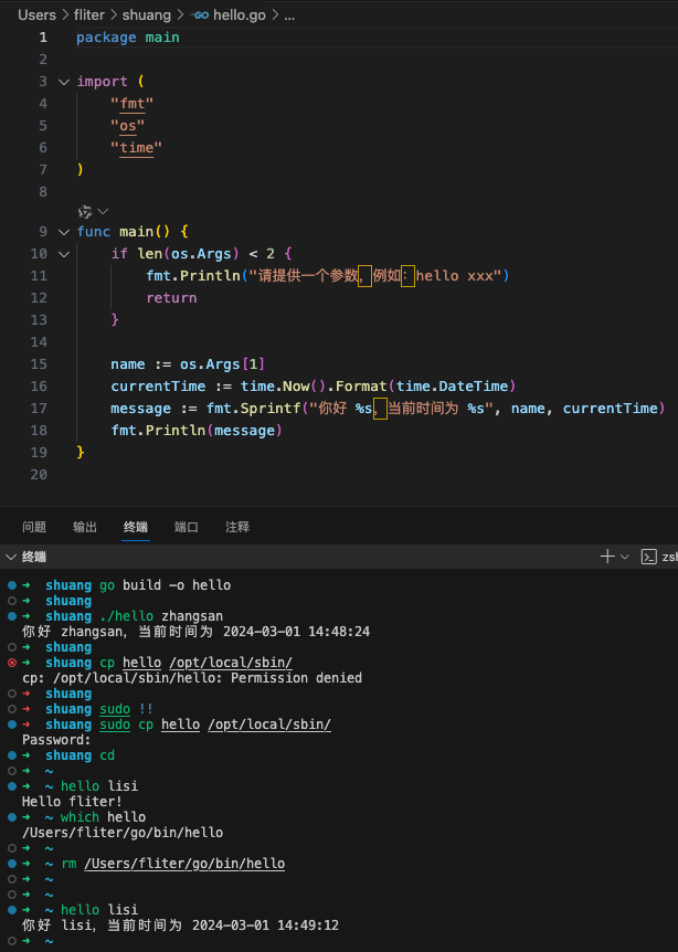 创建一个可执行文件(不一定非要Rust开发,用其他语言如Go也也可以~),将其命名为cargo-hello,并确保这个文件在系统PATH中。