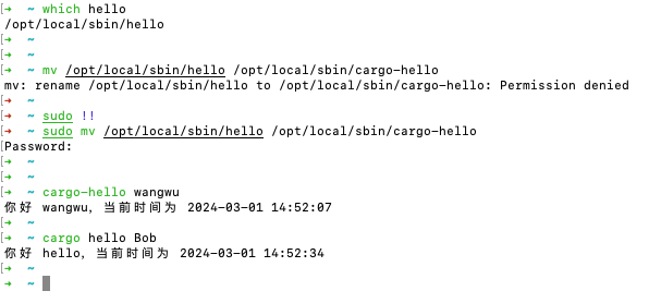 比如我想给cargo增加一个hello的扩展命令, 当执行cargo hello xxx时, 输出你报 xxx,当前时间为 2024-03-01 20:16:18