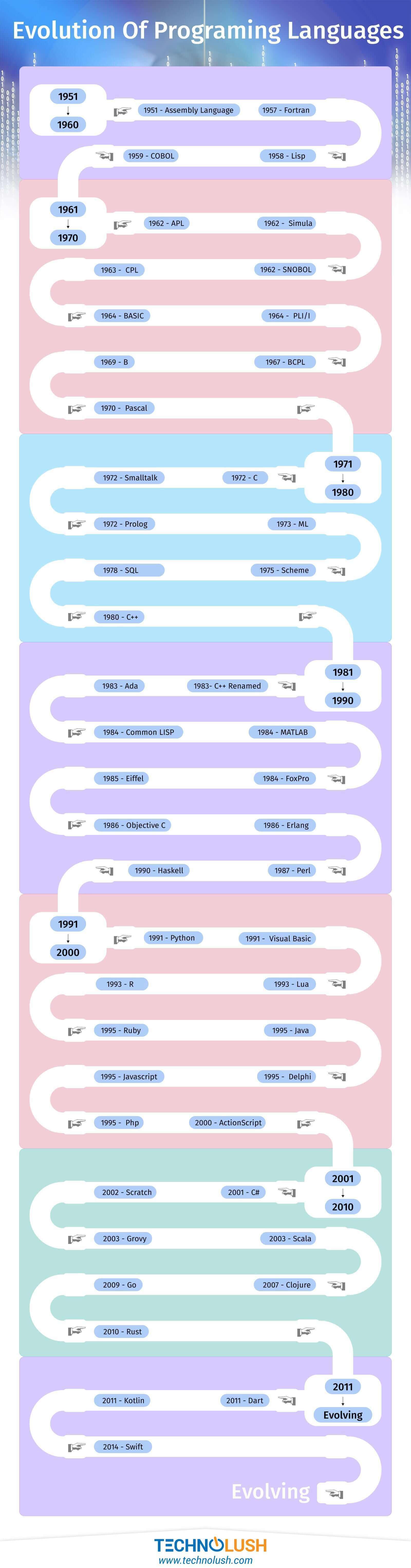 1951 - 1960 - The long-lasting languages evolved over this decade are Fortran and COBOL and laid down the foundation for further evolution. Assembly Language - the first in this list is a low-level programming language and works closure to hardware and specific to computer architecture.
