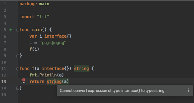 funcmain() { var i interface{} i = "cuishuang" f(i) }