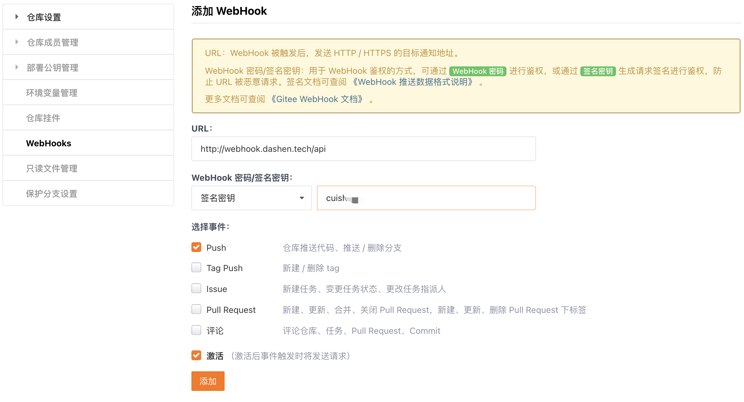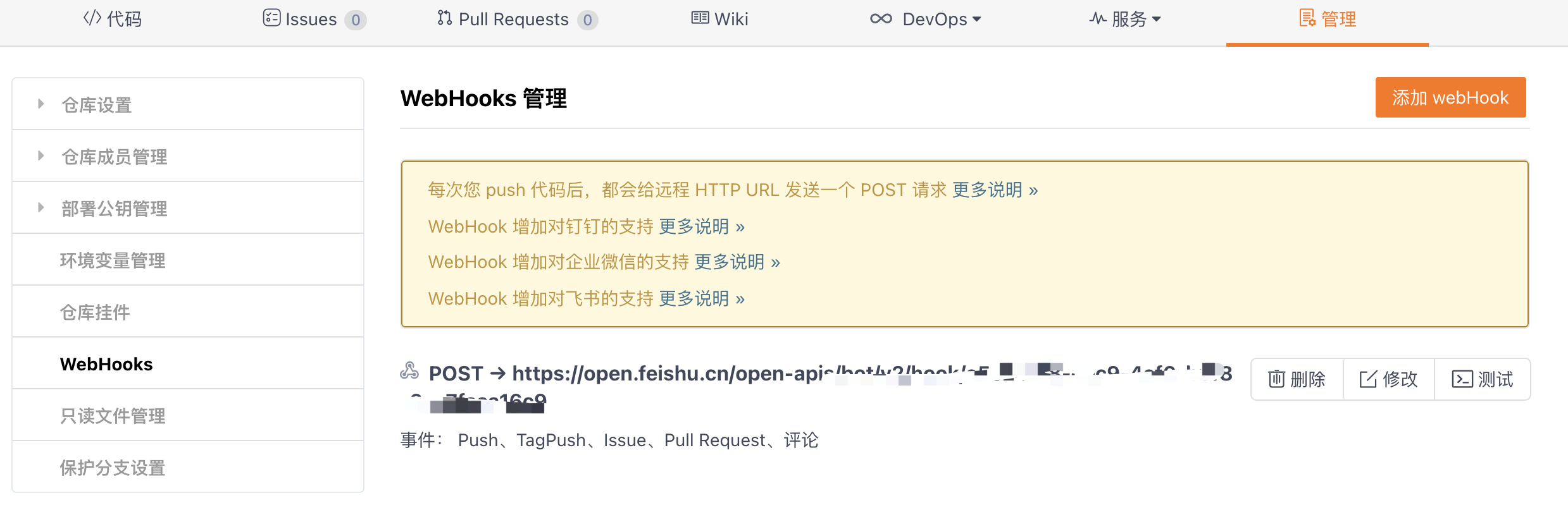 在github/gitlab/gitee中,WebHook 用于在项目发生相关事件时通知外部服务器
