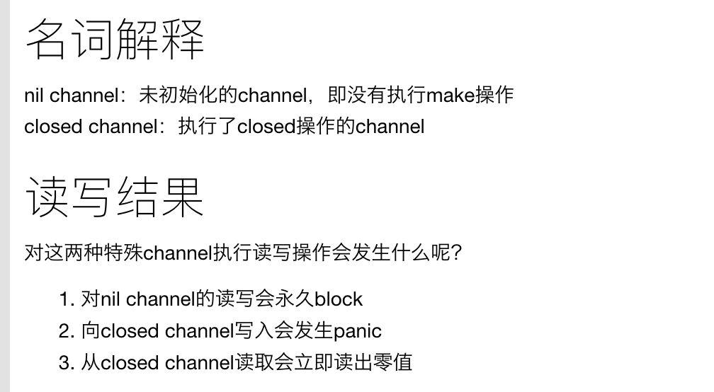 关闭一个nil channel 会导致程序panic;读写一个nil channel,会造成程序阻塞 Go基础系列:nil channel用法示例