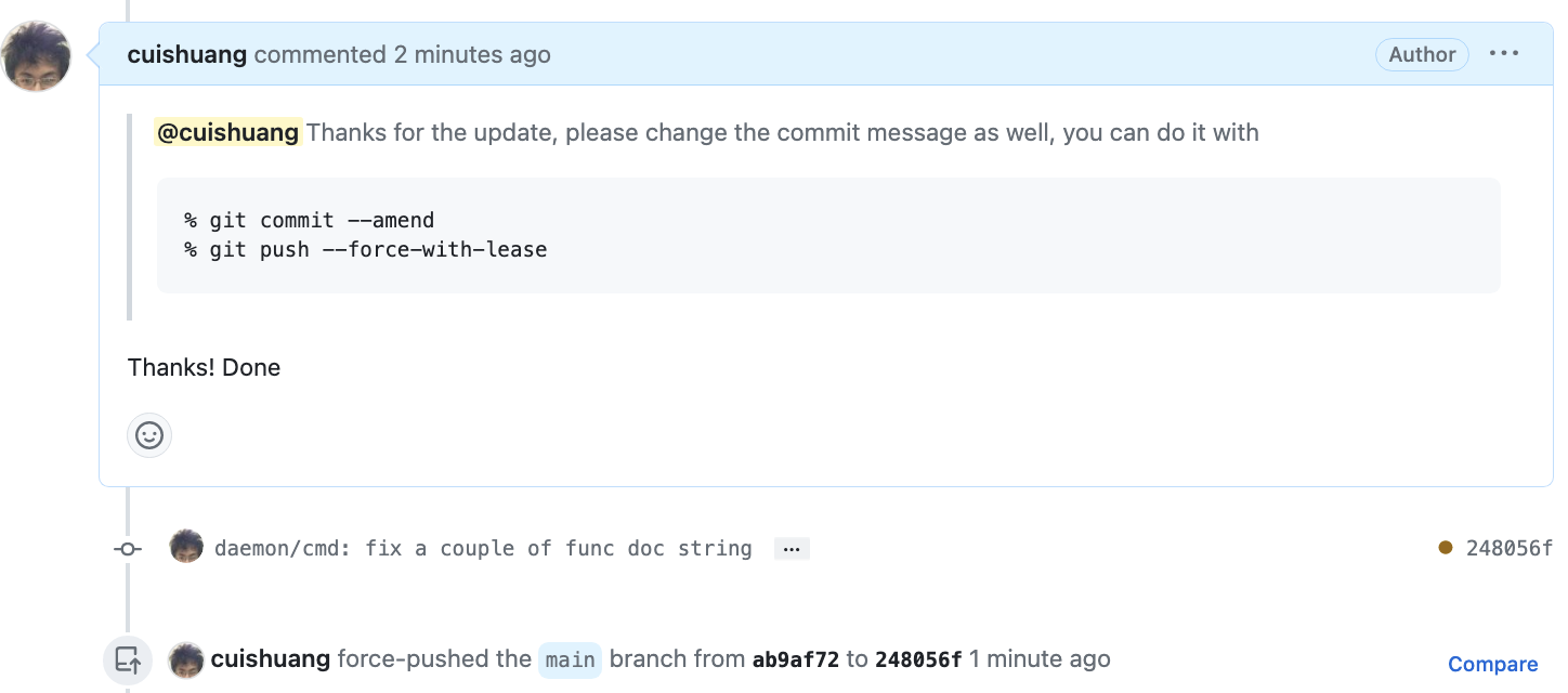 在 GitHub 上,您之前基于 master 创建的 PR 会自动更新为基于 develop 分支的修改。您可以通过在 PR 页面添加一条评论来通知维护者已更新。