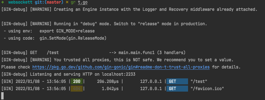 func main() { bindAddress := "localhost:2233" r := gin.Default() r.GET("/test", func(c *gin.Context) { c.JSON(200, []string{"123", "321"}) }) r.GET("/ping", ping) r.Run(bindAddress) }