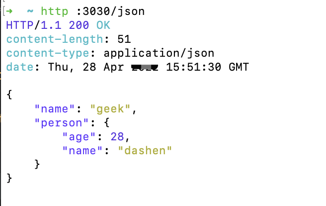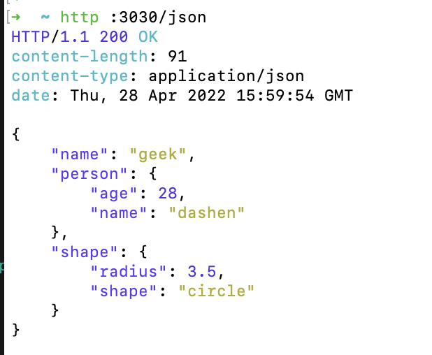 #[tokio::main] async fn main() { let hello = warp::path!("json") .map(|| warp::reply::json( &Demo { name: "geek".to_string(), person: Person { name: "dashen".to_string(), age: 28, }, shape: Shape::Circle { radius: 3.5 }, } ));