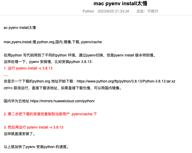 pyenv 是一个轻量级的 Python 版本管理工具,可以在 macOS 上安装和管理多个 Python 版本。使用 pyenv,你可以轻松地切换系统中使用的默认 Python 版本,也可以为每个项目选择特定的 Python 版本。首先,使用 Homebrew 安装 pyenv: