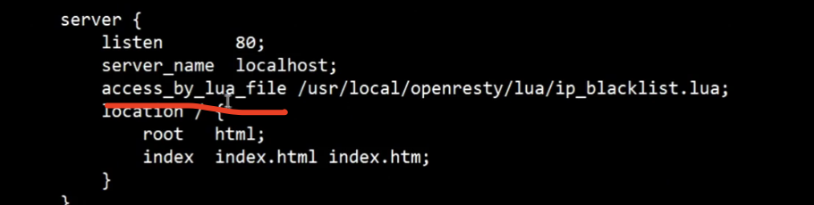 这么一个简单的脚本,就实现了从Redis中检查客户的IP是否被封禁,如果被封禁就拒绝访问。打开Nginx配置文件,在虚拟主机中增加一个access_by_lua_file来指定Lua脚本,就说明这个Lua脚本会在这个虚拟主机中生效,所有访问该虚拟主机的HTTP请求,都会被这个Lua脚本拦截并处理。