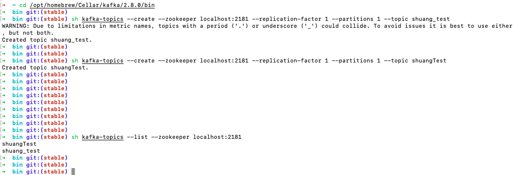 sh kafka-topics --create --zookeeper localhost:2181 --replication-factor 1 --partitions 1 --topic shuangTest