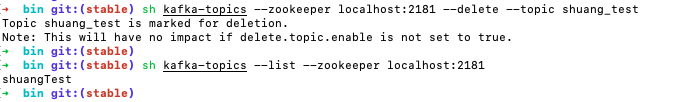 sh kafka-topics --zookeeper localhost:2181 --delete --topic shuang_test