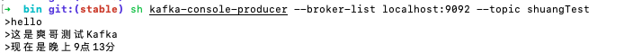 sh kafka-console-producer --broker-list localhost:9092 --topic shuangTest