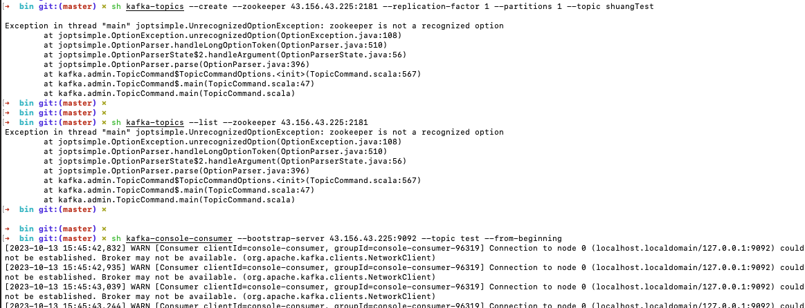 sh kafka-topics –create –zookeeper 43.156.43.225:2181 –replication-factor 1 –partitions 1 –topic shuangTest