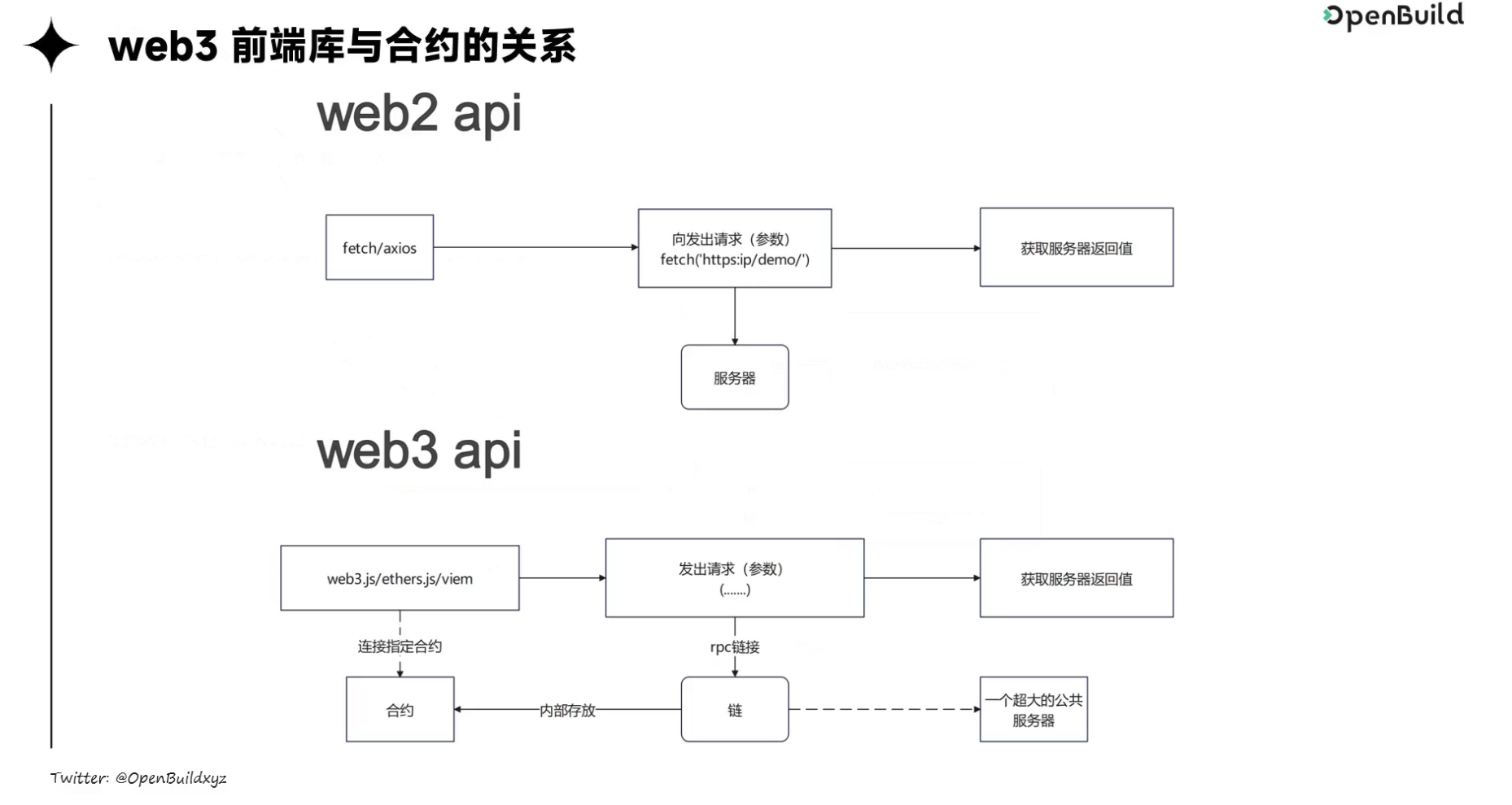 AI课代表的笔记:本视频介绍了Web3前端框架及其与区块链和智能合约的关系。重点讲解了四个核心库:ethers.js、web3.js、wagmi和viem,强调它们在与区块链交互中的不同之处。视频中还解释了区块链的概念,如自带登录验证的服务器特性,以及前端如何通过RPC URL与链进行交互。最后,推荐了相关学习资源,以帮助观众深入理解Web3开发。