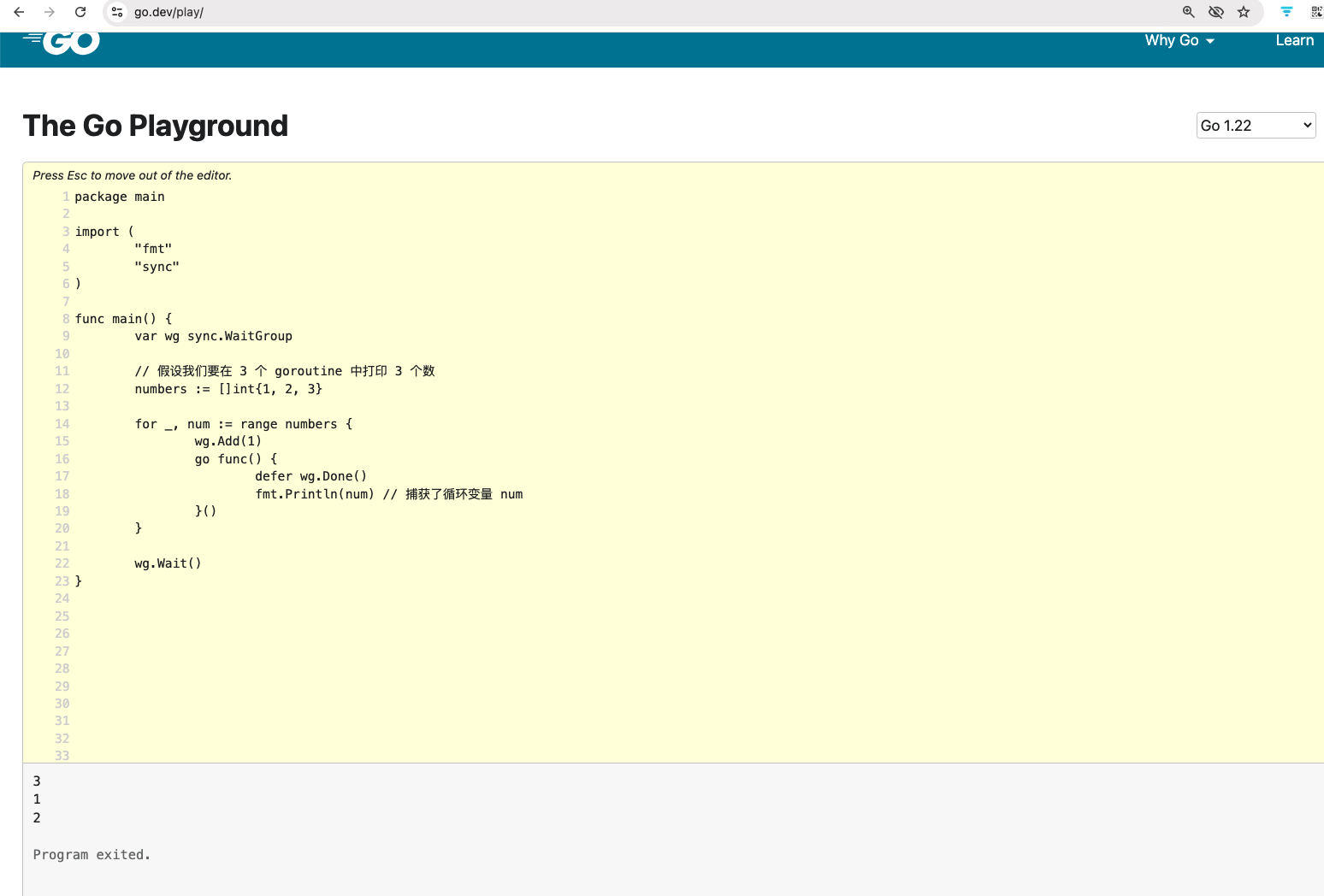 对于go 1.22及以后: https://go.dev/play/p/B2KxciPgtPu?v=goprev