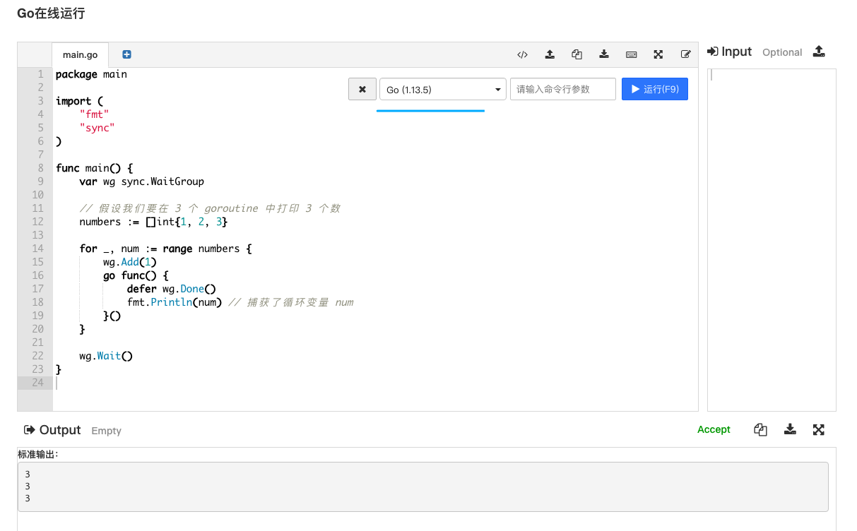 因此,所有的 goroutine 打印的值将是循环结束时的最后一个值,也就是 3。