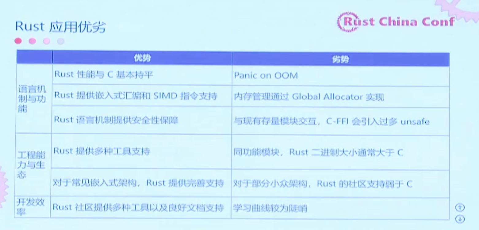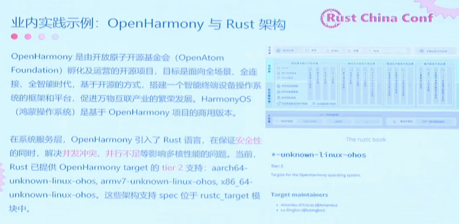 最近有一个热点事件,就是Linux Rust和Linux的maintainer宣布退休了。原因是他在一个Linux开发者会议上讲如何优化Linux的文件系统方面的元数据时,遇到了非常强烈的反对意见。他的十页PPT只讲到五页,讲的时间就用完了。所以后来他说这个太累了,已经放弃了。虽然他在相关领域做了可能好45年,但现在放弃继续往Linux上推广Rust。他最后写道,他仍然坚信Rust是OS、是内核开发的未来。如果Linux不能彻底地Rust化,那么一定会有别的内核去Rust化,更好地把Rust用起来。