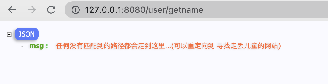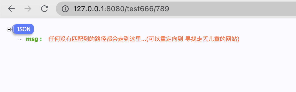 r.NoRoute(func(c *gin.Context) { c.IndentedJSON(http.StatusNotFound, gin.H{ "msg": "任何没有匹配到的路径都会走到这里...(可以重定向到 寻找走丢儿童的网站)", }) })