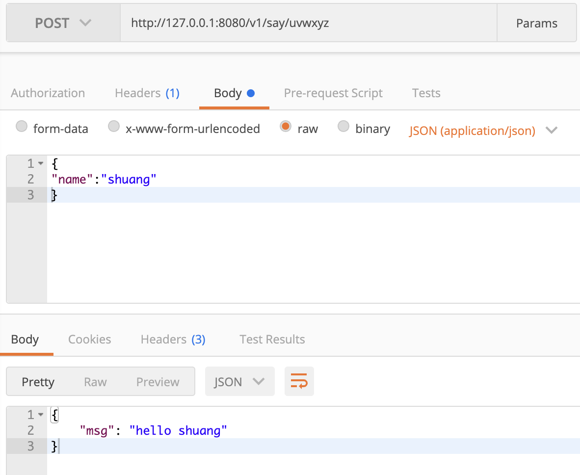 对于接口 /v1/say/xxxx接口(POST方法,参数为body里传一个name类型的json),当say后面为任意字符时,均路由到helloHandler方法进行处理