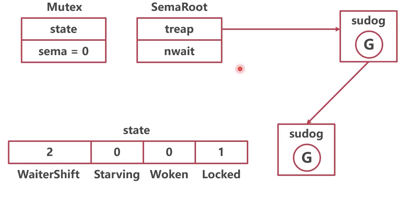 自旋多次(其实是4次)还是0,没能改最低一位时,协程就会进入休眠,转而获取sema(sema>0时才会获取成功),协程会被记入treap中的sudog中,不会再被调度了。 同时WaiterShift字段会被更新