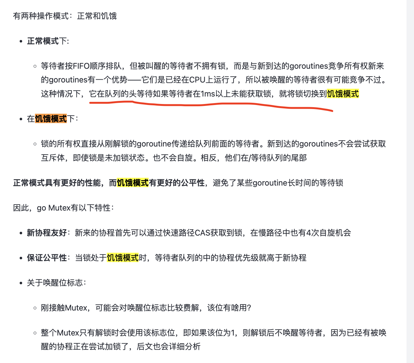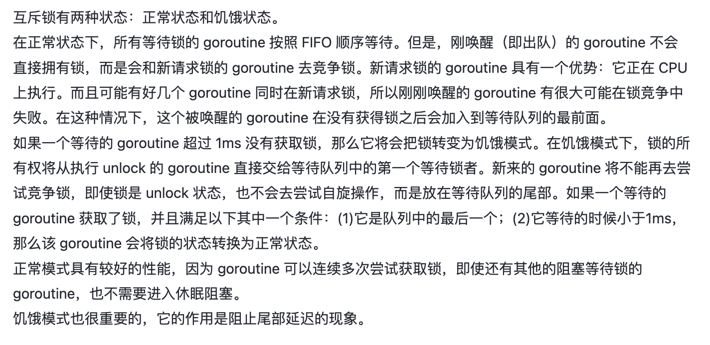 如果一个等待的 goroutine 超过 1ms 没有获取锁,那么它将会把锁转变为饥饿模式。在饥饿模式下,锁的所有权将从执行 unlock 的 goroutine 直接交给等待队列中的第一个等待锁者。新来的 goroutine 将不能再去尝试竞争锁,即使锁是 unlock 状态,也不会去尝试自旋操作,而是放在等待队列的尾部。如果一个等待的 goroutine 获取了锁,并且满足以下其中一个条件:(1)它是队列中的最后一个;(2)它等待的时候小于1ms,那么该 goroutine 会将锁的状态转换为正常状态。