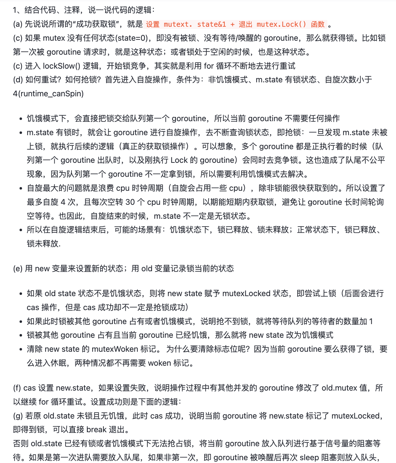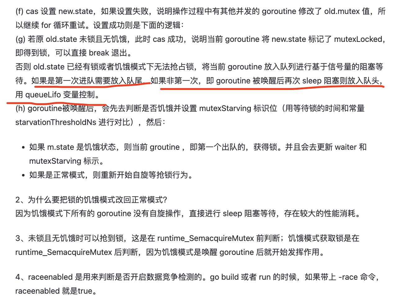如果一个等待的 goroutine 获取了锁,并且满足以下其中一个条件:(1)它是队列中的最后一个;(2)它等待的时候小于1ms,那么该 goroutine 会将锁的状态转换为正常状态。