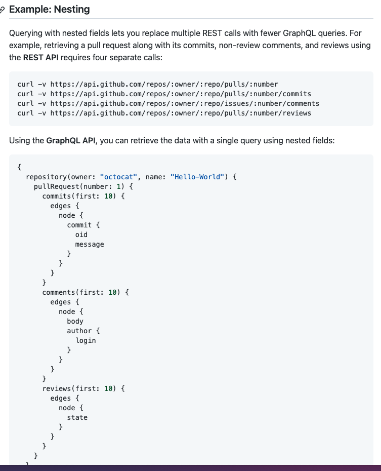 比如想取一个pr的commits、comment、reviews,用REST需要请求四次,然后还需要对返回值进行组装;而用GraphQL则只需要一次请求,拿到的就是需要的数据