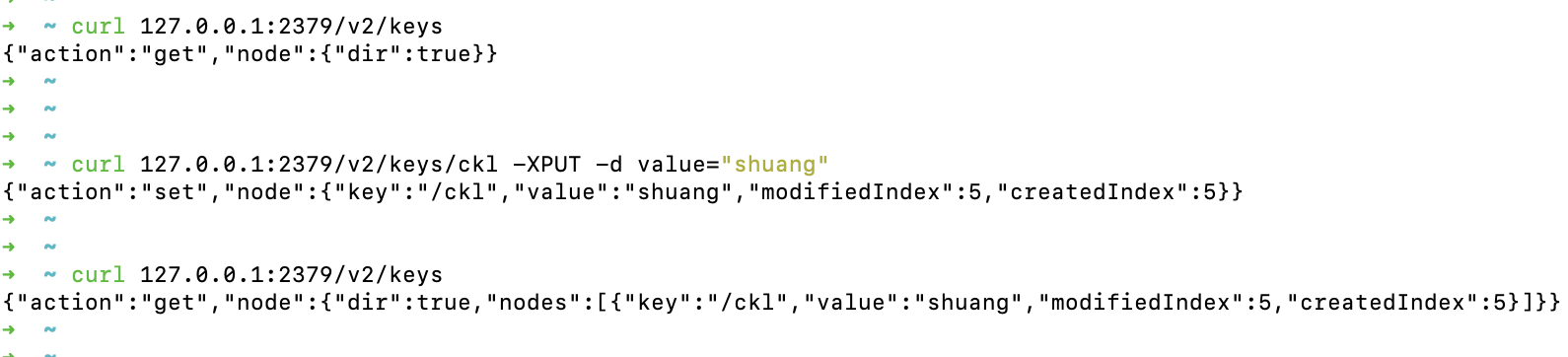 curl 127.0.0.1:2379/v2/keys/ckl -XPUT -d value="shuang"