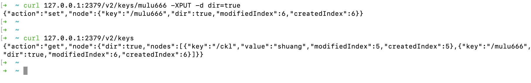 curl 127.0.0.1:2379/v2/keys/mulu666 -XPUT -d dir=true